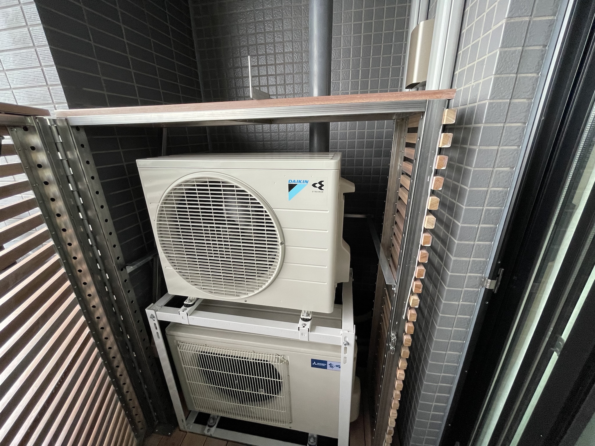 画像のように木材で覆ってあげるだけで簡単に空間が柔らかくなります。もちろんエアコンの機能を落とすことがないように、室外機とカバーのスペースは十分に空け、問題がないように施工いたします。